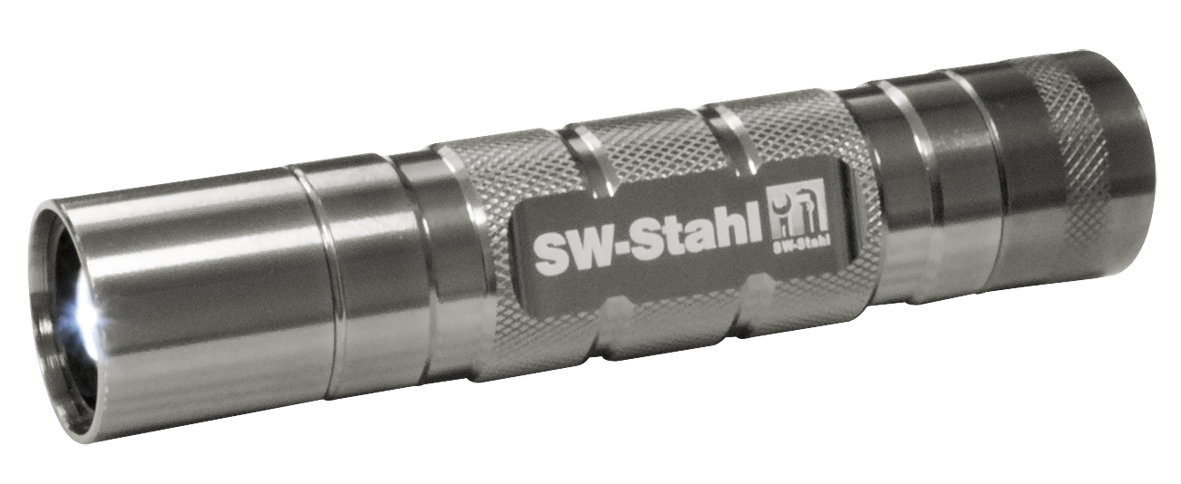 mit Aluminiumgehäuse, gebündelter Lichtstrahl durch Reflektor und Linse.