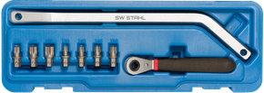 Abgewinkelte Ratsche und 2-fach abgewinkelter Montagehebel mit 8 mm Sechskant Bit- Aufnahme.